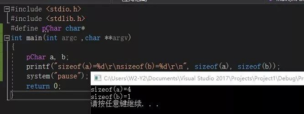 再用pChar 定义两个变量,之后用操作符sizeof读取变量所占用内存大小,如果是指针类型的就占4个字节,如果是字符型的就占1个字节。