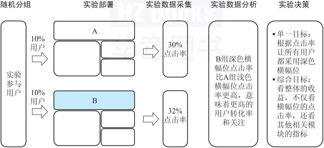 先通过日志系统、业务系统收集各组用户的行为数据和业务数据,然后基于这些数据指标分析、评估出相比之下更好的产品版本,最后推广到全部用户。