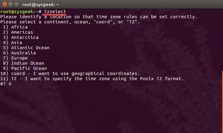 要更改 Linux 系统时区首先得获知你所当地时区的 TZ 值,使用 tzselect 命令即可查看并选择已安装的时区文件。