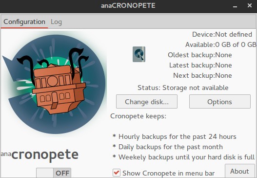 Cronopete自称为OS X的时间机器,与TimeShift工作起来稍有不同。Cronopete为Ubuntu,Debian和Fedora提供了包文件,Arch Linux使用者可以在AUR中找到它。