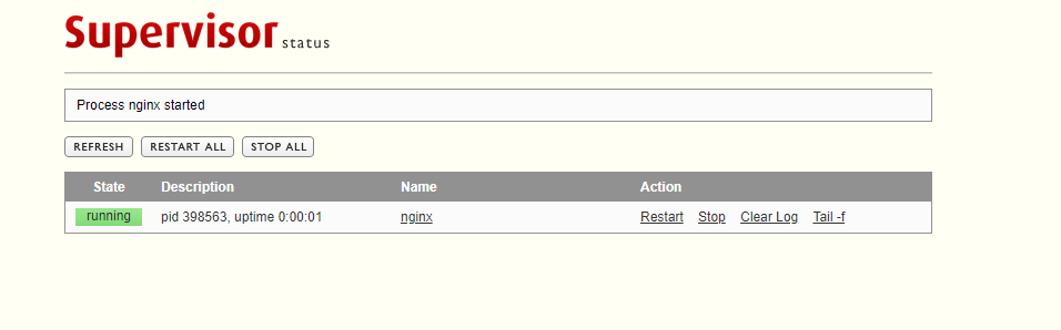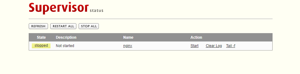 [program:nginx] command=/usr/./sbin/nginx -g 'daemon off;' user=root autostart=false autorestart=true stopasgroup=true killasgroup=true stdout_logfile=/etc/supervisord.d/nginx-out.log stderr_logfile=/etc/supervisord.d/nginx-err.log