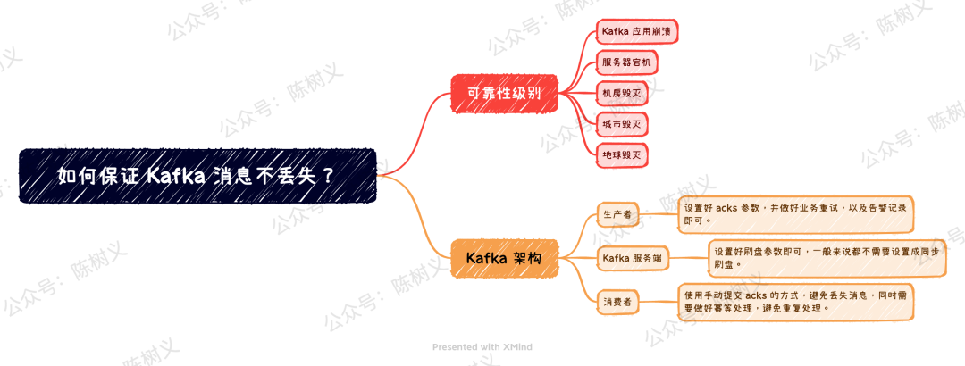 这里所说的某些情况,从严重程度依次为:Kafka 宕机、服务器宕机、机房地震、城市毁灭、地球毁灭。不要觉得树哥在危言耸听,如果你的服务器部署在乌克兰的首都,那是不是就会遭遇城市毁灭的风险了?因此,我们根据业务的重要程度,设置合理的可靠性级别,毕竟可靠性级别越高,付出的成本越高。