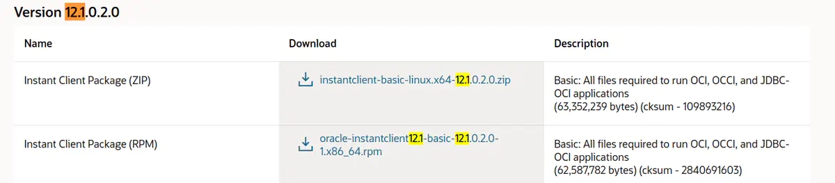 Python、链接Oracle需要Python依赖和本地Oracle客户端,测试环境Oracle版本12.1.0.2.0,开发和测试环境为linux,先安装linux客户端,选择zip解压免安装版本