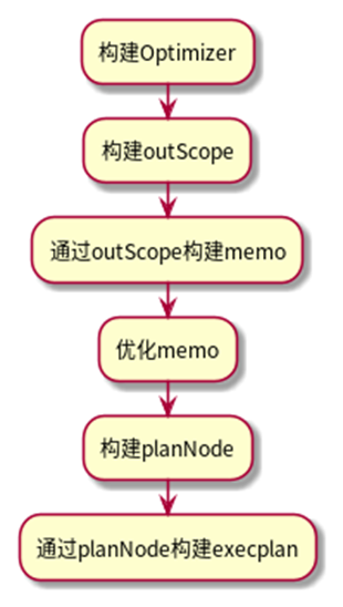 以 create table 语句为例,构建逻辑计划主要是进行 memo 的构建以及 RBO 和 CBO 优化(memo 是用来存储查询计划森林的一种数据结构)。首先会初始化一个优化计划的上下文 optPlanningCtx,里面会初始化优化器并记录是否使用 memo cache 进行 memo 的缓存复用,而这也是 DDL 与 DML 语句之间的区别,DDL 语句不会复用 memo。
