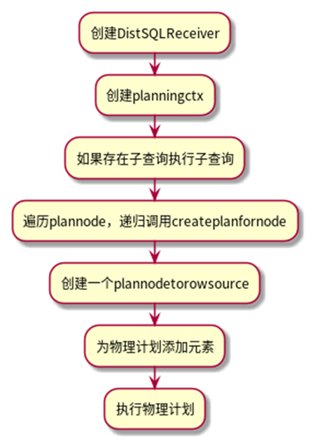 函数首先判断当前 planNode 的类型,调用对应的函数为 planNode 创建物理计划 (如 indexJoinNode 会调用 createPlanForIndexJoin),DDL 则会递归调用 wrapPlan 将 planNode 包起来继续处理 (wrapPlan 只包装节点本身而不包括孩子节点)。然后,调用 shouldPlanTestMetadata 函数判断是否需要进行元数据处理,如果需要则添加相关信息)。然后再进行创建 planNodeToRowSource(该结构体),如果被包裹的 planNode 是 flow 中的第一个 node,且语句类型是 RowsAffected(返回受影响行的计数的语句)则可以使用 fast path,planNode 子树若支持 DistSQL 优化会在被优化后连接到 wrapper。返回 wrapper 后,为物理计划添加 LocalProcessor 和 LocalProcessorIndexes 的元素,LocalProcessors 数组包含了所有的 planNodeToRowSource,即被包裹的 planNode,记录物理计划的 ResultTypes。