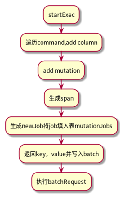 StartExec 是具体执行 planNode 的方法,根据构建的物理计划对表描述符进行操作。StartExec 会先对 commend 遍历(以 alter table 为例,commend 是一个表修改操作的切片),在遍历中获取集群版本信息,检查在当前版本中是否支持添加列的类型,若支持则为 true,反之报错;接着按照计划中的列定义信息生成列描述符,若添加的列是主键或含有唯一性约束,还会生成索引描述符,将这些描述符会包装成一个个 mutation 并添加到表描述符的 Mutations 字段里;然后根据表、mutation 等信息创建一个 job,job 也是通过系统表 system.jobs 进行维护,这个 job 是用来触发及跟踪 schema change 执行,接着将含有 mutations 的表描述通过 batch 更新到系统表 "descriptor" 里。