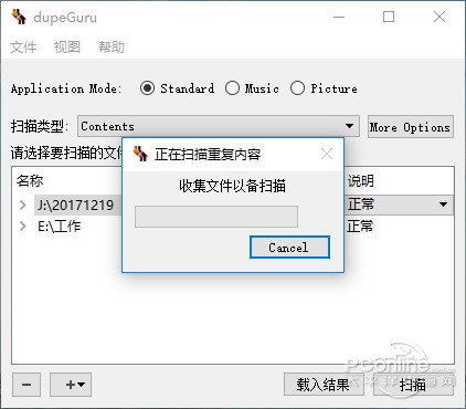 dupeGuru的操作界面简单,菜单栏+应用类型+扫描类型+目录选择+载入结果、扫描组成主操作界面。