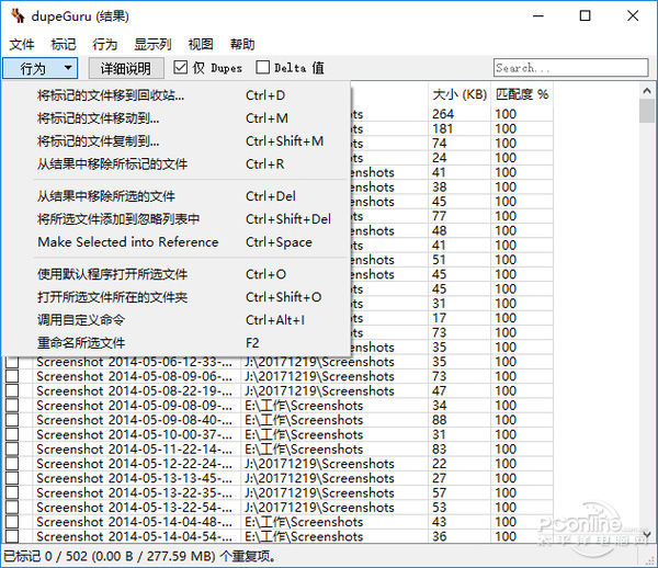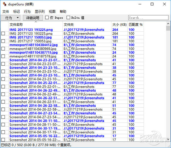 在扫描结果中,你可以看到重复文件的名称、所在目录、大小及匹配度,这时用户就可以自行选择需要删除或移动的文件,双击文件名可打开该文件。选择勾选仅Dupes则可以选择仅显示重复文件。