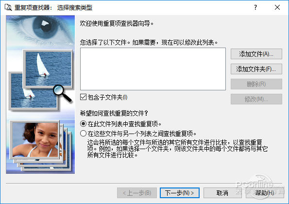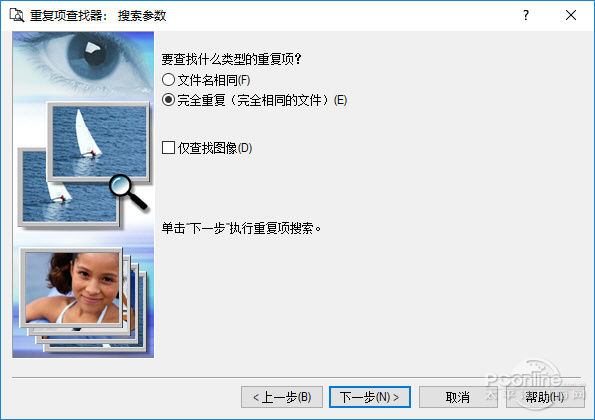 在目录选项中可以选择添加文件或文件夹,然后就选择如何查找重复文件。接着选择选择扫描参数,用户可以选择扫描文件名重复还是完全重复,还能仅查找图像。