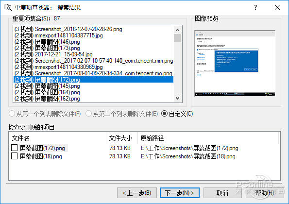 接着稍后片刻就可以得到扫描结果,ADCSEE采用了重复项合并显示,用户需要逐个勾选需要合并的重复文件,较为不便,同样的点击文件名可以预览图片。