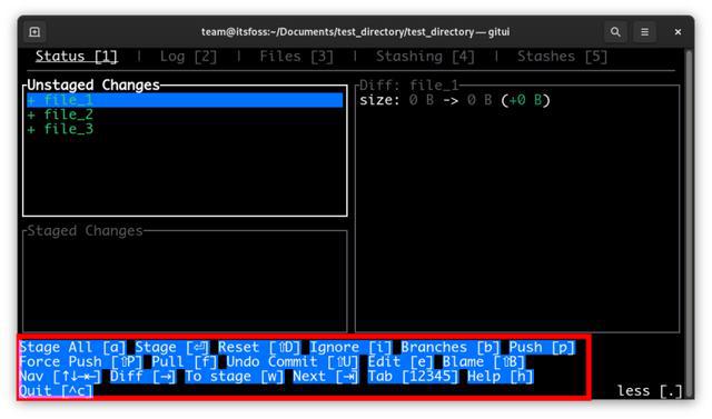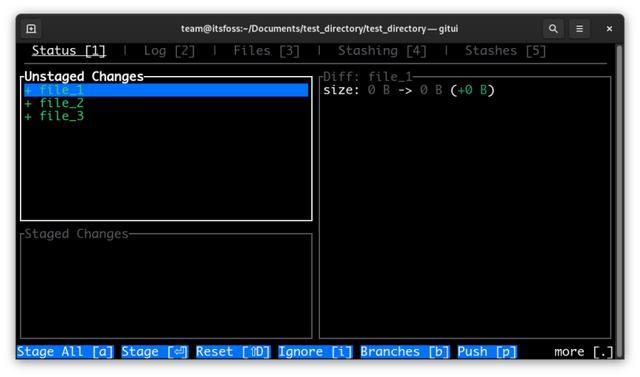 值得一提的是,这个界面有一个快速而直观的纯键盘控制。一切都很简单,只需输入正确的字母即可将文件暂存、提交、分支或推送到 git 仓库中。