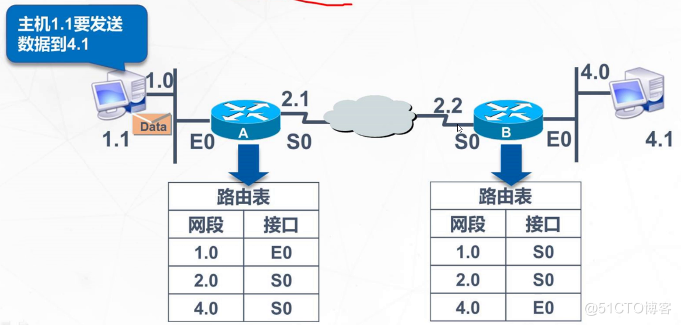 主机1.1要发送数据到4.1;路由器A收到数据,查看数据包中的目标地址为4.1,查找路由表;路由器B接收到数据包,查看数据包的目标地址,并查找路由表;主机4.1接收到数据包