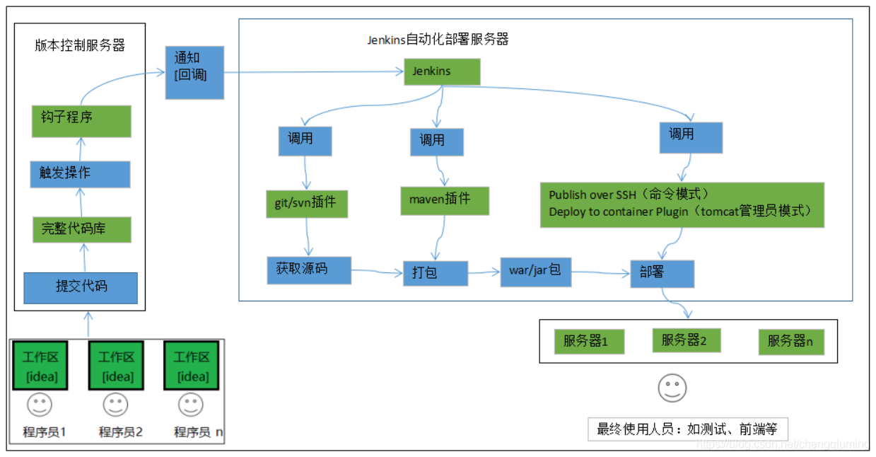 开发者提交代码到码云 -> 码云上配置的回调地址会通知jenkins进行自动部署 -> jenkins 拉取最新的源码,打包成jar或war,将打好的包上传到Linux服务器,最后根据Jenkins上配置的命令进行部署。