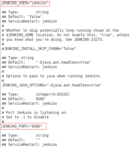 vim /etc/sysconfig/jenkins #编辑文件 JENKINS_PORT="8080" #端口 JENKINS_USER="jenkins" #登入用户 JENKINS_HOME="/var/lib/jenkins" #安装home目录