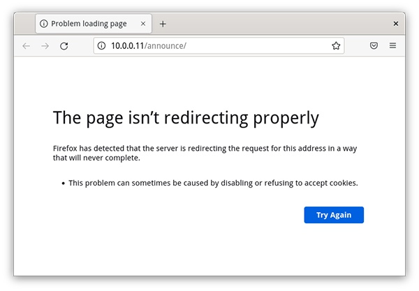 $ wget -O /tmp/test.html -S http://10.0.0.11/announce/ --2021-08-24 17:09:49-- http://10.0.0.11/announce/ Connecting to 10.0.0.11:80... connected. HTTP request sent, awaiting response... HTTP/1.1 302 Found Date: Tue, 24 Aug 2021 22:09:49 GMT Server: Apache/2.4.48 (Fedora) X-Powered-By: PHP/7.4.21 Location: http://10.0.0.11/assets/ Content-Length: 0 Keep-Alive: timeout=5, max=100 Connection: Keep-Alive Content-Type: text/html; charset=utf-8 Location: http://10.0.0.11/assets/ [following] --2021-08-24 17:09:49-- http://10.0.0.11/assets/ Reusing existing connection to 10.0.0.11:80. HTTP request sent, awaiting response... HTTP/1.1 302 Found Date: Tue, 24 Aug 2021 22:09:49 GMT Server: Apache/2.4.48 (Fedora) X-Powered-By: PHP/7.4.21 Location: http://10.0.0.11/announce/ Content-Length: 0 Keep-Alive: timeout=5, max=99 Connection: Keep-Alive Content-Type: text/html; charset=utf-8 Location: http://10.0.0.11/announce/ [following] --2021-08-24 17:09:49-- http://10.0.0.11/announce/ Reusing existing connection to 10.0.0.11:80. . . . 20 redirections exceeded.