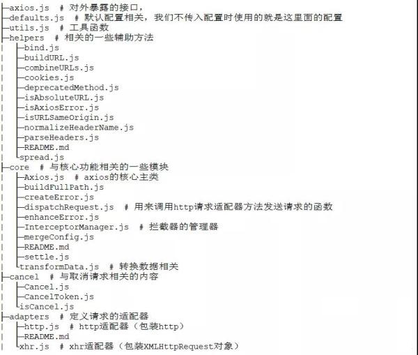 理解了该库设计的特点,下面从源码目录、抽象接口及核心设计原理三个层面对Axios进行整体的把握。