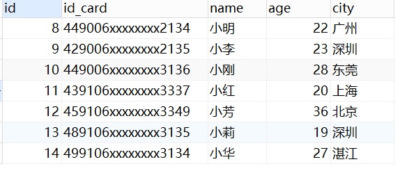 CREATE TABLE `staff` ( `id` bigint(11) NOT NULL AUTO_INCREMENT COMMENT '主键id', `id_card` varchar(20) NOT NULL COMMENT '身份证号码', `name` varchar(64) NOT NULL COMMENT '姓名', `age` int(4) NOT NULL COMMENT '年龄', `city` varchar(64) NOT NULL COMMENT '城市', PRIMARY KEY (`id`), KEY `idx_age_name` (`age`,`name` desc) USING BTREE ) ENGINE=InnoDB AUTO_INCREMENT=15 DEFAULT charset=utf-8 COMMENT='员工表';