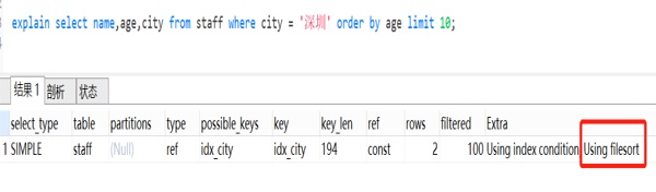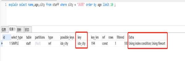 explain select name,age,city from staff where city = '深圳' order by age limit 10;