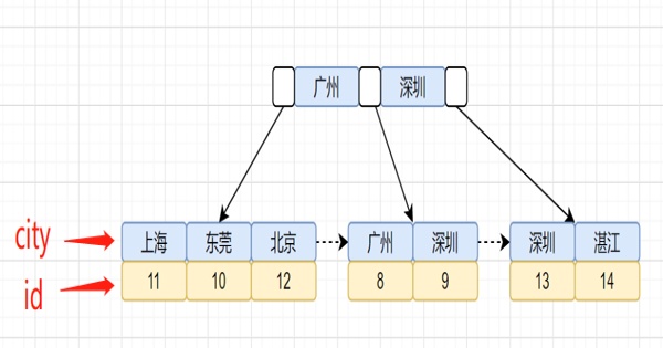 我们回顾下索引是怎么找到匹配的数据的,现在先把索引树画出来吧,idx_city索引树如下: