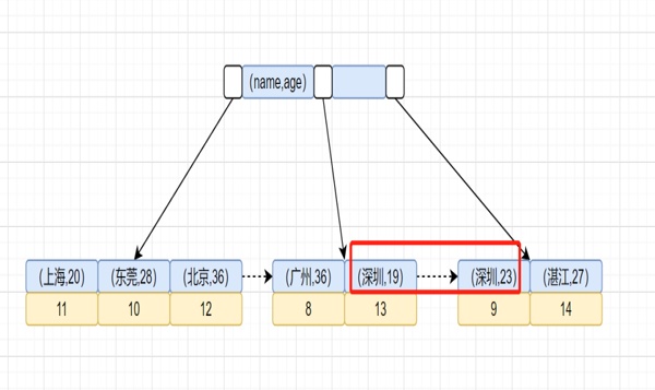 可以发现,加上idx_city_age联合索引,就不需要Using filesort排序了。为什么呢?因为索引本身是有序的,我们可以看下idx_city_age联合索引示意图,如下: