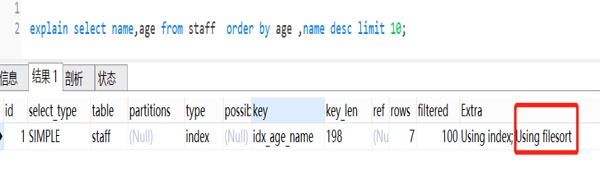 我们看下执行计划,发现使用到Using filesort