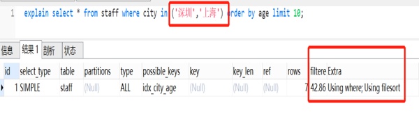 explain select * from staff where city in ('深圳','上海') order by age limit 10;