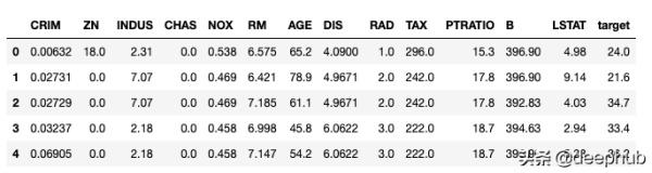上面是我们的数据集的前五行。有13个特征,我们可以看到一个目标变量是一个连续的数字。这是一个完美的回归数据集。