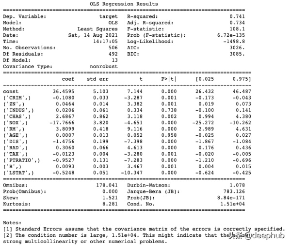 import statsmodels.api as sm X = sm.add_constant(df.drop(columns=[‘target’])) # adding a constant model = sm.OLS(df.target, X).fit() predictions = model.predict(X) print_model = model.summary() print(print_model)
