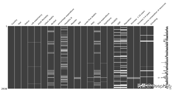 可以看到缺失值的位置。如果怀疑丢失的值位于某个特定位置或遵循某个特定模式,那么它将非常有用。
