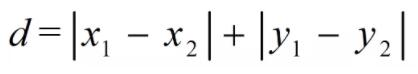 两个像素点X方向和Y方向的距离之和。欧式距离表示的是从一个像素点到另一个像素点的最短距离,然而有时我们并不能以两个点之间连线的方向前进,例如在一个城市内两点之间的连线可能存在障碍物的阻碍,因此从一个点到另一个点需要沿着街道行走,因此这种距离的度量方式被称为街区距离。街区距离就是由一个像素点到另一个像素点需要沿着X方向和Y方向一共行走的距离,数学表示形式如式所示。