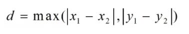 两个像素点X方向距离和Y方向距离的最大值。与街区距离相似,棋盘距离也是假定两个像素点之间不能够沿着连线方向靠近,像素点只能沿着X方向和Y方向移动,但是棋盘距离并不是表示由一个像素点移动到另一个像素点之间的距离,而是表示两个像素点移动到同一行或者同一列时需要移动的最大距离,数学表示形式如式所示。