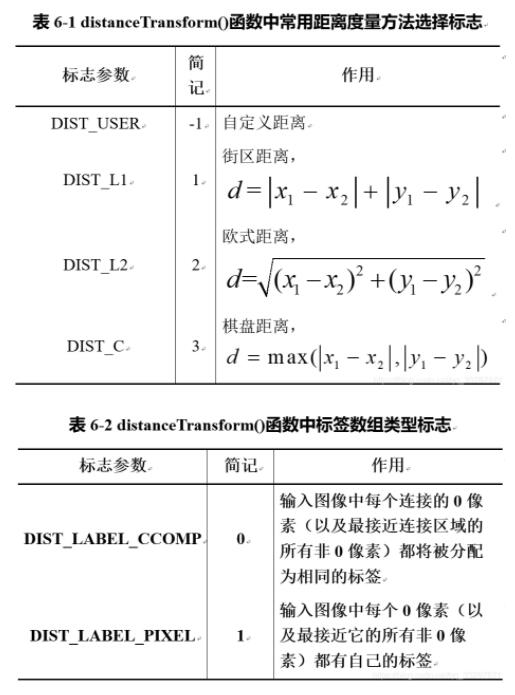 - 函数第四个参数是距离变换过程中使用的距离种类,常用的距离为欧式距离(DIST_L2)、街区距离(DIST_L1)和棋盘距离(DIST_C)。