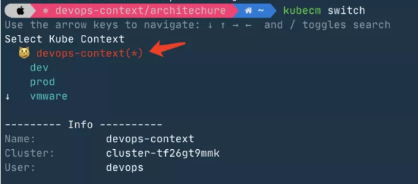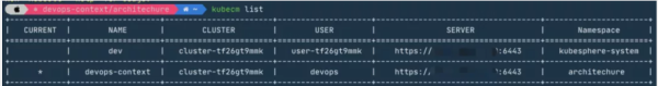 此时,从下图就可以查看到当前集群的有一个新的用户角色devops,上面用到的Kubecm我们之前也分享过,如果需要可以点此跳转