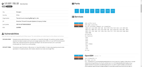 针对这种问题,最好的防护方法就是自己做扫描检测,在fofa、shodan、zoomeye、censys等网络搜索引擎,直接输入自己的服务器ip地址,即可看到服务器暴露了哪些服务、哪些端口,从而进行确认自己服务器的安全问题可能出现在那里