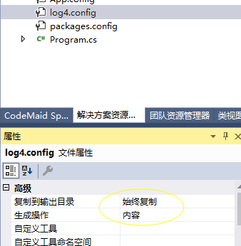 当我们在项目里添加nuget包时,查看输出窗口,可以看到我们的ps1脚本被自动执行了,它修改了log4.config的文件属性,它让具有“始终复制”到输出目录的属性!