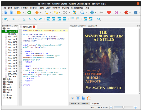 Sigil 是一个开源的 Linux、Windows 和 MacOS 上的 EPUB 编辑器。你可以使用 Sigil 创建一个新的 EPUB 格式的电子书,或编辑现有的 EPUB 电子书(以 .epub 扩展结尾的文件)。