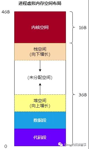 程序中使用的内存地址都是虚拟内存地址,也就是说,我们通过 malloc 函数申请的内存都是虚拟内存。实际上,内核会为每个进程管理其虚拟内存空间,并且会把虚拟内存空间划分为多个区域,如 图3 所示: