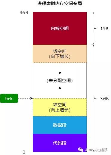 由此可知,通过 malloc 函数申请的内存地址是由 堆空间 分配的(其实还有可能从 mmap 区分配,这种情况暂时忽略)。在内核中,使用一个名为 brk 的指针来表示进程的 堆空间 的顶部,如 图4 所示: