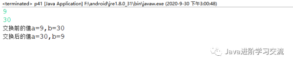 System.out.println("交换后的值"+"a="+a+",b="+b);