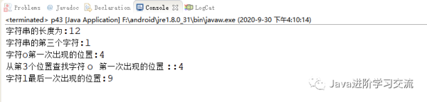 System.out.println("字符l最后一次出现的位置:"+str.lastIndexOf('l'));