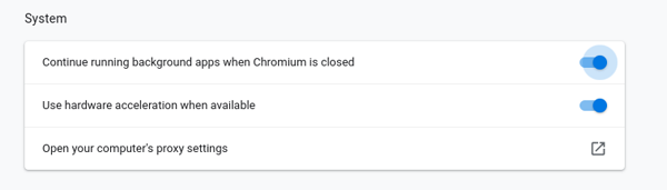 你也能寻找其他方式来管理进程。在我这个案例中,我并不需要在我退出浏览器后,使用 kill 或 killall 来终止后台 Chromium 进程。在 Chromium 中有个简单设置就可以进行控制: