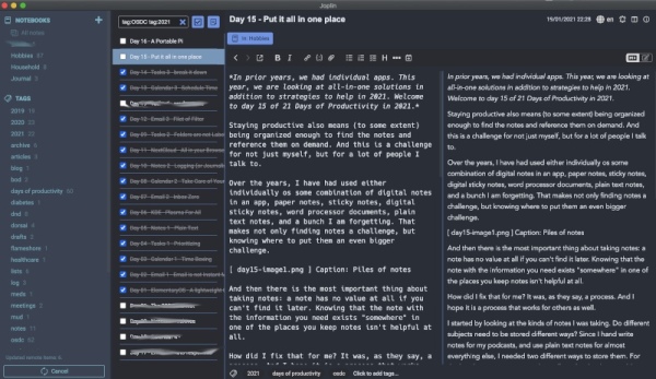 为了保存我的数字笔记,我需要将它们全部集中到一个地方。这个工具需要能够从多种设备上访问,具有有用的搜索功能,并且能够导出或共享我的笔记。在尝试了很多很多不同的选项之后,我选择了 Joplin。Joplin 可以让我用 Markdown 写笔记,有一个相当不错的搜索功能,有适用于所有操作系统(包括手机)的应用,并支持几种不同的设备同步方式。另外,它还有文件夹和标签,因此我可以按照对我有意义的方式将笔记分组。