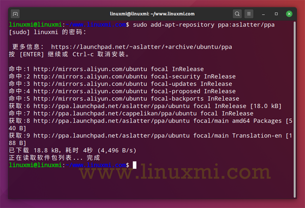 linuxmi@linuxmi:~/www.linuxmi.com$ sudo add-apt-repository ppa:aslatter/ppa