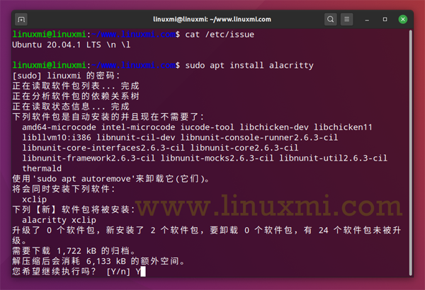 linuxmi@linuxmi:~/www.linuxmi.com$ sudo apt install alacritty