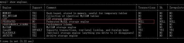 1、先查看MySQL数据库是否安装了FEDERATED引擎,通过命令show engines;如下图: