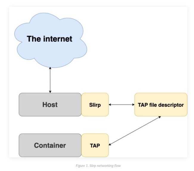 Slirp最初被设计为面向非特权用户的Internet连接。 随着时间的流逝,它成为虚拟机和仿真器(包括著名的QEMU)的网络堆栈,可对其修改调整以启用无根容器中网络连接。它把容器用户和网络名称空间分开并创默认路由设备。 然后,它将设备的文件传递给默认网络名称空间的父级,使其可以与容器和Internet进行通信。