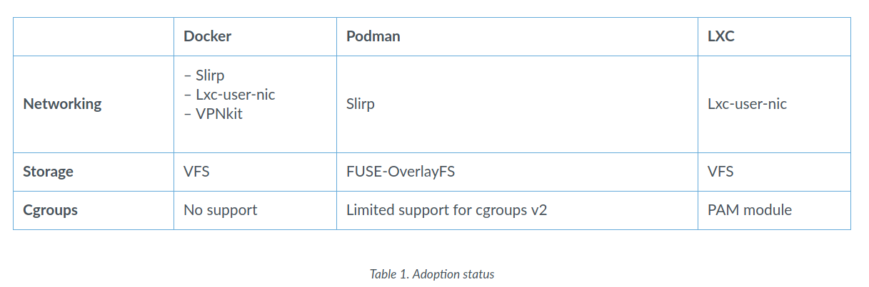 容器的复杂元素之一是存储管理。 默认情况下,容器使用Overlay2(或Overlay)创建文件系统,但是无根容器不能做到这一点,大多数Linux不允许在用户名称空间中安装overlay文件系统。解决方案是使用其他驱动程序,例如VFS存储驱动程序。虽然有效但效率低。更好的解决方案是创建新的存储驱动程序,适应无根容器的需求。
