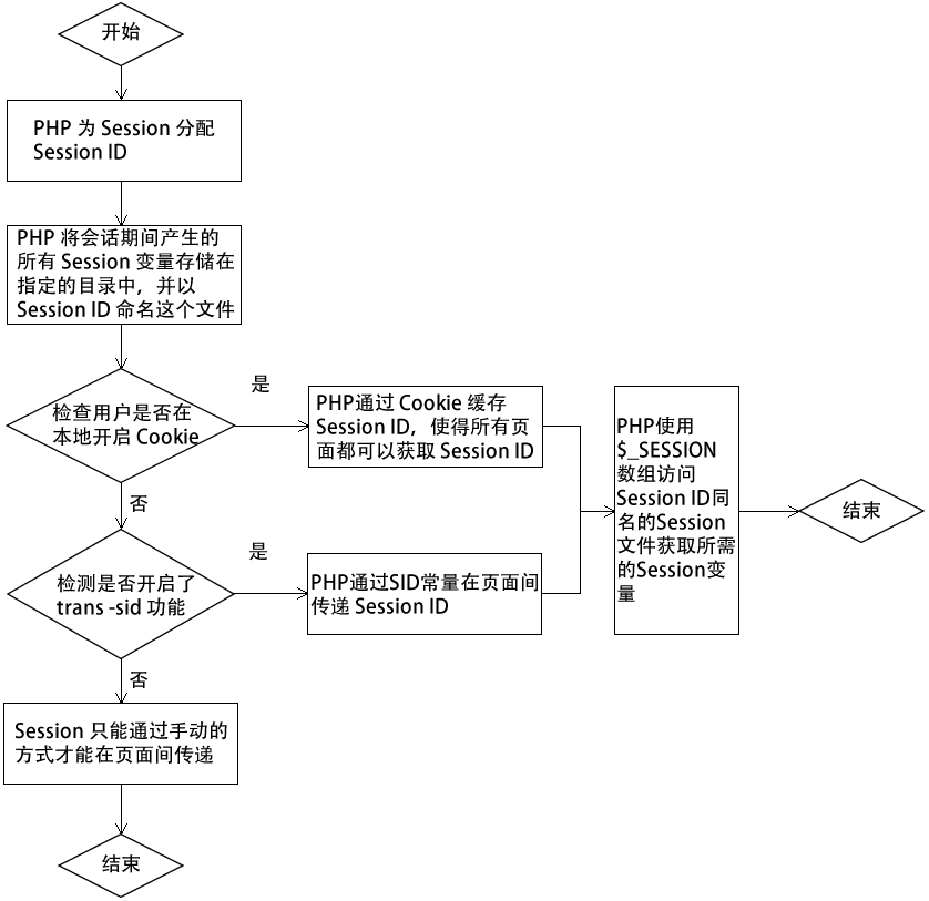 我们可以使用 PHP 脚本创建和存储 Session 中的数据。在创建一个 Session 后,所有 Session 变量在用户一次会话期间里访问的所有页面都有效。其工作机制如下图所示。