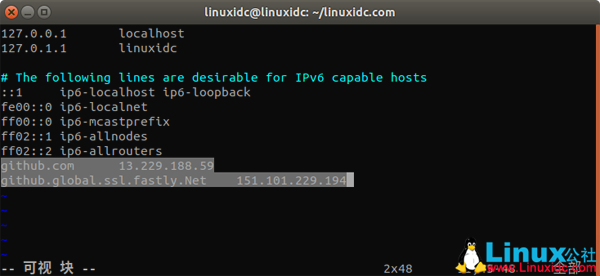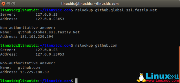 linuxidc@linuxidc:~/linuxidc.com$ nslookup github.global.ssl.fastly.Net Server:? 127.0.0.53 Address: 127.0.0.53#53 Non-authoritative answer: Name: github.global.ssl.fastly.Net Address: 151.101.229.194 linuxidc@linuxidc:~/linuxidc.com$ nslookup github.com Server:? 127.0.0.53 Address: 127.0.0.53#53 Non-authoritative answer: Name: github.com Address: 13.229.188.59