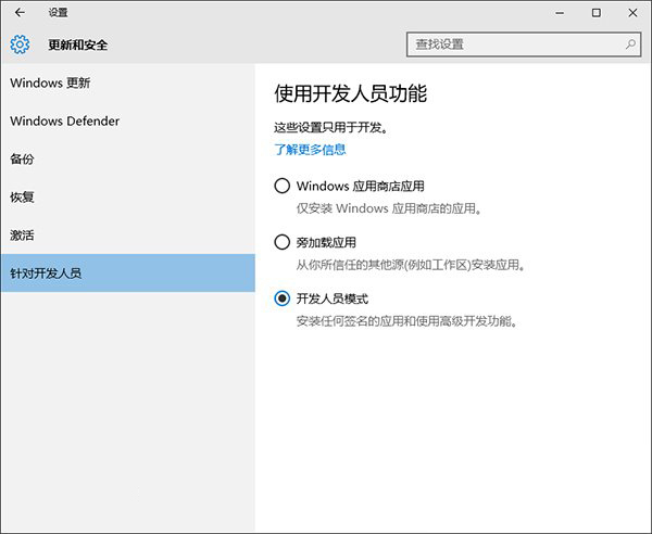 1、首先需要用户将Win10系统升级到Build 14316版本。系统设置——更新和安全——针对开发人员——选择开发者模式。